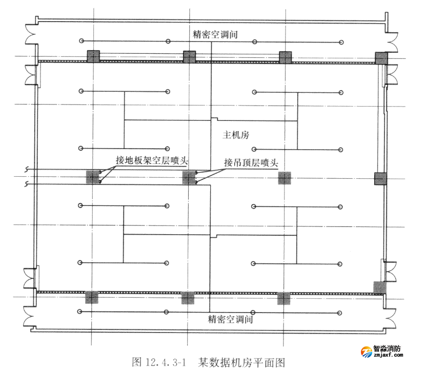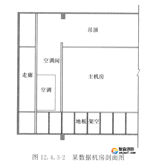 圖12.4.3-1、圖12.4.3-2所示分別為某數據機房的平面圖及剖面圖,在數據機房中經常會遇到空調間與主機房看似分隔,而架空層和吊頂層卻是相通的情況,空調系統采用下送風、上回風的氣流組織方式,此時需將空調間和主機房視為一個防護區,此防護區容積=(S空調間十S主機房)X(h吊頂層十h凈高十h架空層)。