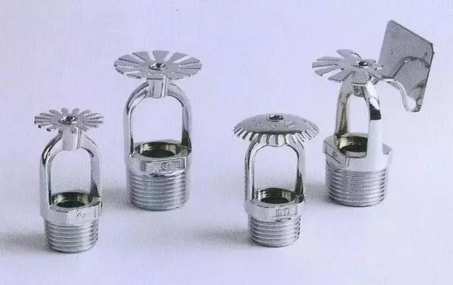 自動噴頭是閉式自動噴水滅火系統的關鍵組件,系通過熱敏感釋放機構的動作而噴水。它由噴水口、溫感釋放器(控制器)和濺水盤組成,其形狀和樣式較多,下圖為常用的低熔點金屬控制器自動噴頭和爆炸瓶式自動噴頭。
