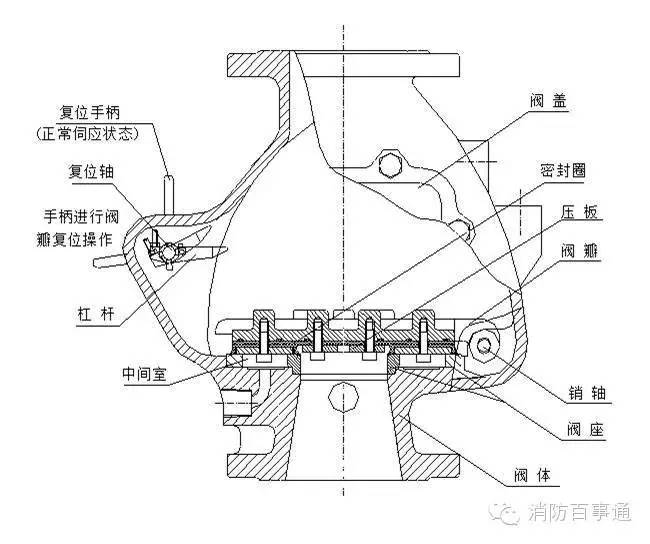 本閥具有防復位和外部復位裝置,當閥打開以后,杠桿將閥瓣頂住使其不再回到閥座上,需外部逆時針轉動復位手柄復位(復位后需將手柄重新回到豎直位置)。
